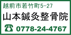 院名 山本鍼灸整骨院 住所 〒915-0063 福井県越前市若竹町5-27 営業時間 平日